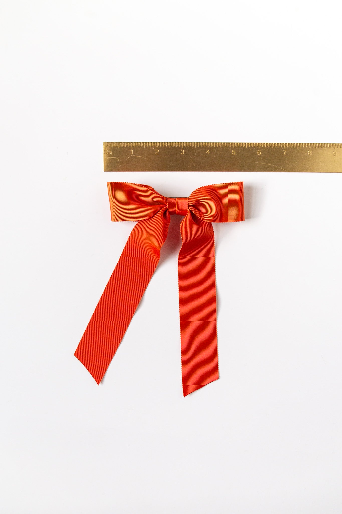 The Oversized Florence Bow measures approximately 5.5" wide and tails are approximated 8.25" long from top of bow to longest tip. This bow is secured on a 3" barrette.